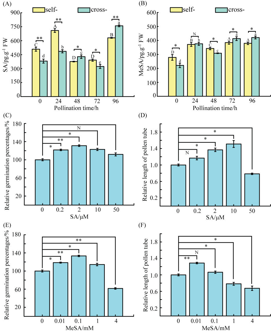 油茶(Camellia oleifera Abel.)是后期自交不亲和树种。后期自交不亲和性是目前植物生殖生物学与分子生物学领域的研究热点,但其分子机制尚不清楚。课题组对水杨酸(SA)及水杨酸甲酯(MeSA)对油茶花粉管生长的影响进行了深入研究,为揭示它们调控油茶花粉管生长及自交不亲和性机制奠定基础。