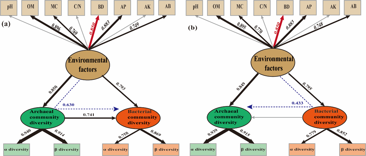 本研究首次利用共现性网络分析揭示桉树人工林替代原生植被以及焚烧采伐剩余物5年后林地微生物的共存模式并且利用结构方程模型探究环境因子是怎样通过古菌群落直接和间接影响细菌群落的α和β多样性,而细菌群落对古菌群落没有直接的影响但是环境因子通过细菌群落的介导对古菌群落有着显著的间接影响。整体而言,环境因子对古菌群落的影响显著高于细菌群落。从长远来看,在人工林经营过程中保留采伐剩余物、林下保护和减少土壤干扰有助于尾叶桉人工林土壤古菌和细菌群落多样性的恢复。这些研究结果可为我国桉树人工林的经营管理策略的制订与修订提供科技支撑。