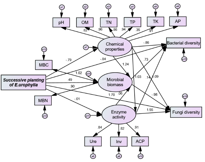 本系列研究首次采用结构方程模型调查连续种植桉树对土壤特性和微生物群落的直接和间接影响,发现桉树人工林的连续种植显著降低了土壤化学性质,酶活性以及微生物生物量碳和氮,进而显著改变了细菌和真菌的群落组成;连栽模式对桉树人工林土壤细菌和真菌群落结构多样性,微生物生物量和酶活性的影响主要通过土壤环境因子驱动。为了实现桉树人工林的可持续经营管理,应将土壤微生物群落多样性作为土壤健康评价指标。