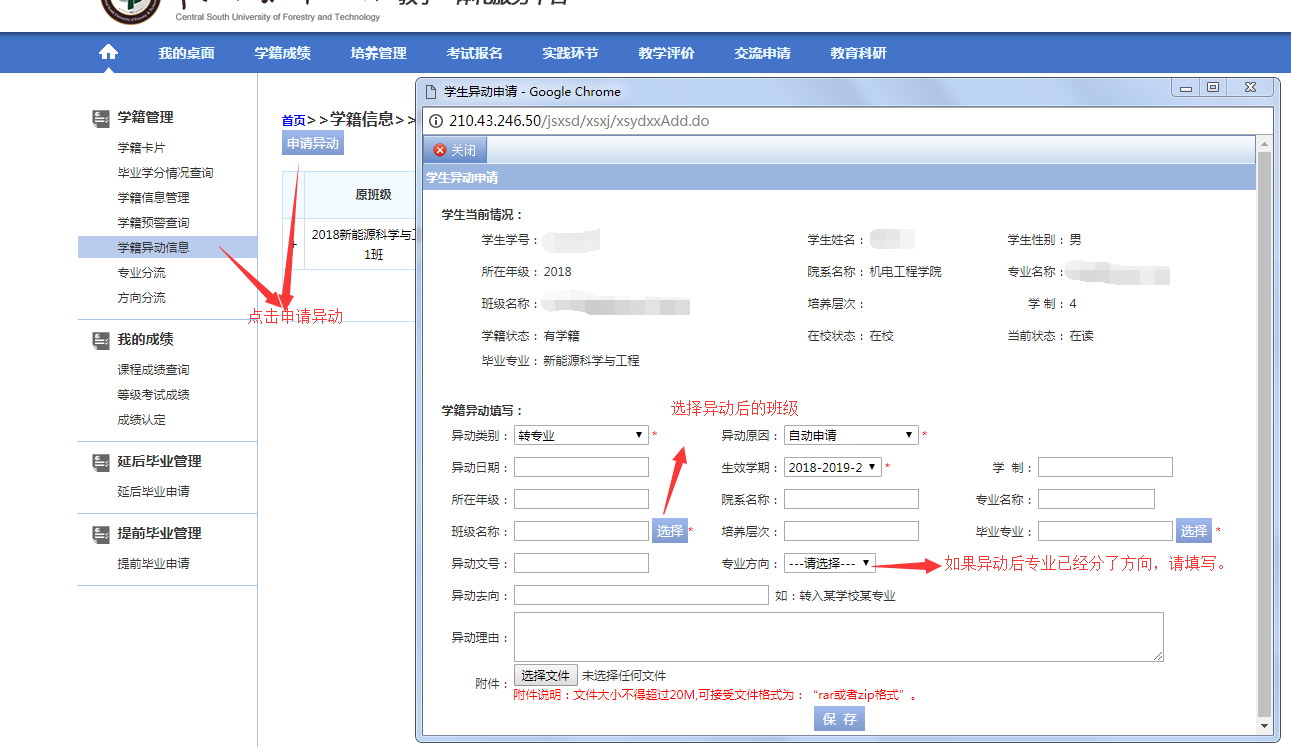 (1)2020年12月9日至12月10日学生本人在教务系统学籍管理模块中提出异动申请,并在所属学院填写《中南林业科技大学本科学生转专业申请表》(见附表二)并附相关材料,