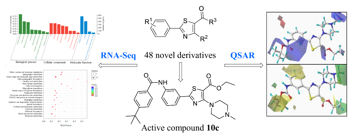随着农药的长期频繁使用,病原菌抗药性问题日益严峻,开发作用机制新颖、高效安全杀菌剂具有重要意义。本研究基于噻呋酰胺结构,通过合理的骨架跃迁策略,设计合成了48个结构新颖的2-苯基噻唑衍生物,发现了具有优异广谱抑菌活性的先导化合物10c,活性优于商品化药剂噻呋酰胺。初步作用机制研究表明,10c 可能通过影响几丁质合成酶相关代谢通路抑制真菌生长,该作用机制与现有杀菌剂不同,为新作用机制杀菌剂的开发提供了重要候选。此外,本研究还建立了预测性良好的3D-QSAR模型,为后续高活性衍生物的理性设计提供了理论依据。上述研究成果不仅为开发新型噻唑类杀菌剂提供了有价值的先导化合物和重要的理论依据,也为针对几丁质合成酶为靶标的绿色杀菌剂研发提供了新思路。