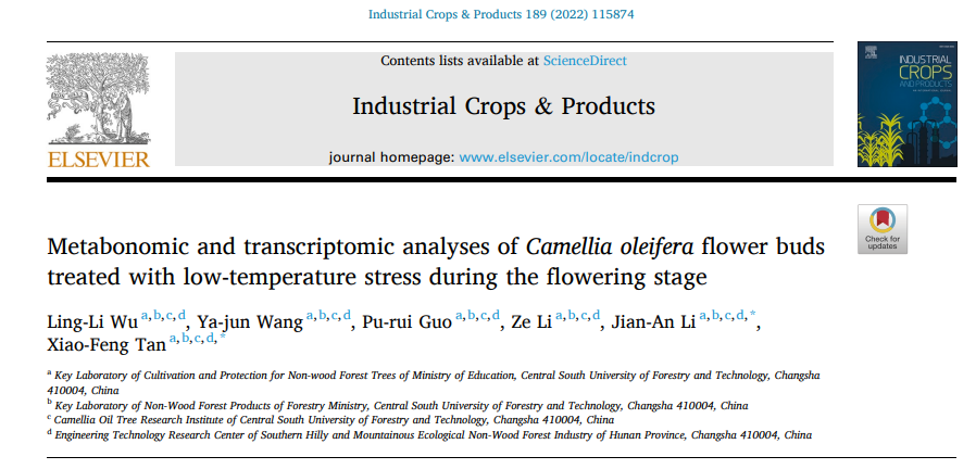 2022年11月2日,农林科学TOP期刊《Industrial Crops & Products》(中科院一区,IF: 6.449)在线发表了经济林创新团队题为“Metabonomic and transcriptomic analyses of Camellia oleifera flower buds treated with low-temperature stress during the flowering stage”的研究论文。文章报道了糖类化合物在低温胁迫后期大量累积,是油茶响应低温胁迫最丰富的代谢物,鉴定了油茶花期抗寒关键候选基因,揭示了CoWRKY5能够通过糖代谢途径参与油茶花期的抗寒应答,是油茶花期低温胁迫响应的重要转录因子。