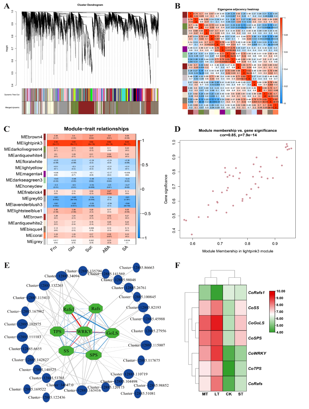 图2加权基因共表达网络分析(WGCNA)结果及油茶糖代谢关键基因共表达网络图