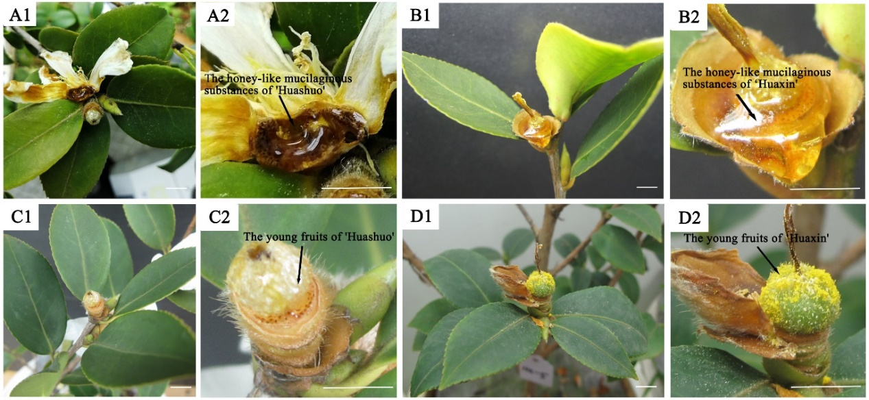 团队前期研究发现,油茶花期遭遇低温胁迫时部分花苞不开或开放不完全、花苞萎蔫脱落且花期推迟,随着胁迫时间的延长,花苞逐渐开放,花瓣凋谢但不脱落,花的基部和子房周围有蜜状物质出现(图1),可有效减少落花落果(Wu et al., 2020a; Wu et al., 2020b)。