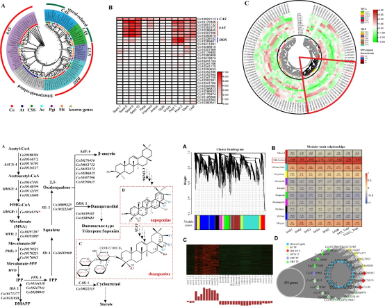 本研究基于油茶‘华硕’基因组对三萜化合物生物合成涉及的多个基因家族成员进行识别,包括整个三萜骨架合成途径及CYP450和UGT基因家族,并与拟南芥、茶、猕猴桃、人参和蒺藜苜蓿进行了系统发育分析。最终在油茶中共鉴定出143个三萜骨架生物合成基因、1169个CYP450和1019个UGT。对不同组织和不同发育时期的种子进行转录组分析,结果表明MVA是三萜骨架生物合成的主要途径。此外,通过WGCNA和qRT-PCR分析表明11个CYP450、14个UGT和8个转录因子可能参与茶皂苷的合成。本研究初步揭示了油茶中茶皂苷的生物合成途径,并从分子层面探明了油茶种子中茶皂苷的合成主要时期为8、9、10月份,且主要皂苷类型为齐墩果酸型。我们的结果为进一步研究茶皂苷的生物合成和调控网络提供了有价值的信息。