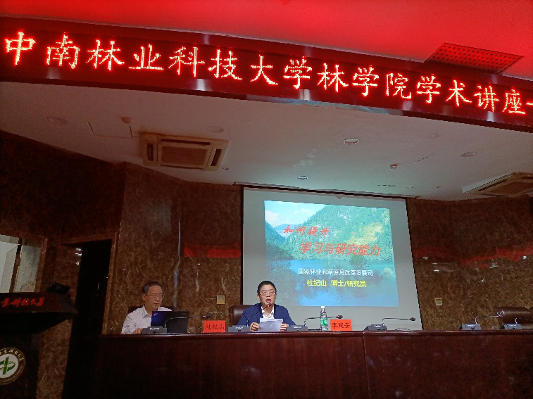2020年9月27日下午,国家林业与草原局改革发展司杜纪山一级巡视员(博士、研究员)在图书馆报告厅为林学院师生讲授了《如何提高学习与研究能力》的学术讲座。讲座由林学院院长李建安教授主持,林学院领导、教师及研究生二百余人认真聆听了此次讲座。