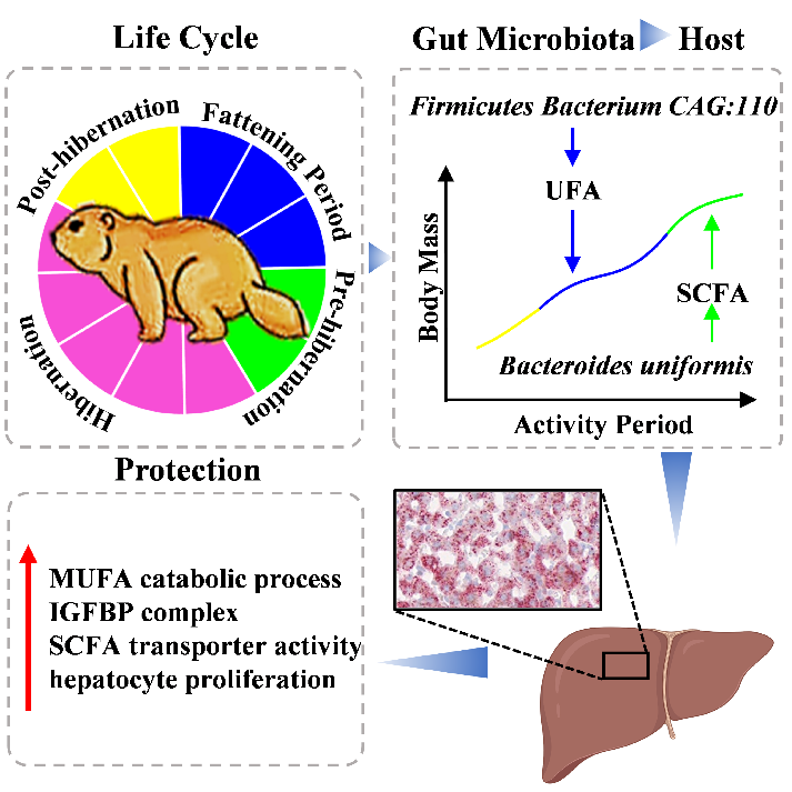研究发现,不饱和脂肪酸(unsaturated fatty acid)是导致喜马拉雅旱獭体重增加的主要原因,然而哺乳动物无法自身合成这种脂肪酸,需要从外界获取;青藏高原的植被呈现明显的季节性,在植被稀少匮乏的时候它们如何吸收不饱和脂肪酸呢?进一步研究发现,喜马拉雅旱獭育肥阶段可通过上调肠道细菌中的厚壁菌(Firmicutes Bacterium CAG:110)的方式合成不饱和脂肪酸,以弥补食物的不足。